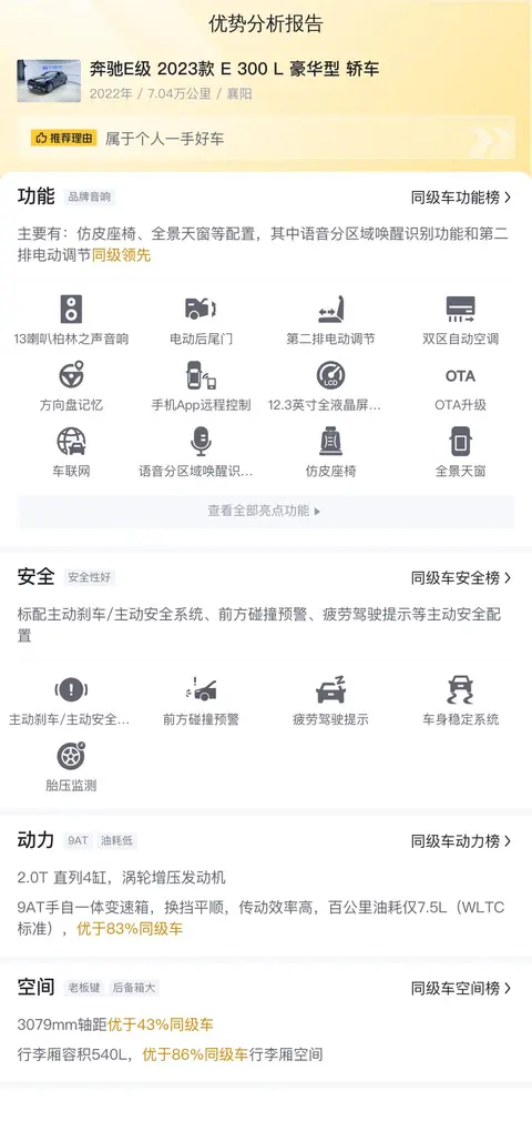 接下来,我们来简单谈谈这款车的优缺点。作为一款豪华轿车,奔驰E级 2023款 E 300 L 豪华型在动力性能、配置丰富度以及品牌影响力等方面都有着不俗的表现。其2.0T发动机提供了强劲的动力输出,无论是城市通勤还是长途旅行都能应对自如。车内豪华氛围浓厚,座椅舒适度高,智能互联和娱乐系统丰富,满足了现代消费者对科技与舒适的双重追求。奔驰E级作为品牌旗下的中坚力量,市场认可度高,保值能力相对较强,这对于购车者来说是一个不容忽视的优势。然而,任何车型都不是完美的。奔驰E级 2023款 E 300 L 豪华型同样存在一些不足之处。首先,其较高的维护成本可能让一部分消费者望而却步。其次,虽然动力充沛,但燃油经济性并非其强项,尤其是在城市拥堵路况下,油耗可能会相对较高。此外,部分车主反映悬挂系统偏硬,影响了乘坐的舒适性;车内储物空间设计不尽合理,缺乏足够的储物格,对于随身物品的放置略显不便。