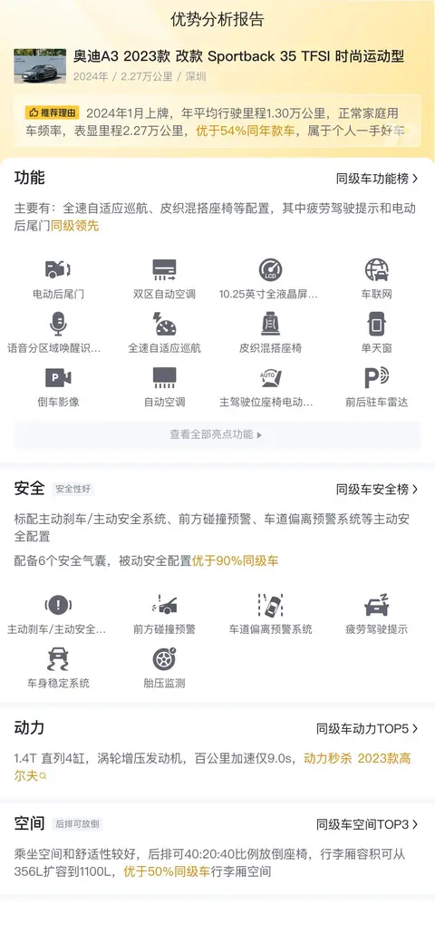 这辆奥迪A3 2023款 改款 Sportback 35 TFSI 时尚运动型在车况、配置、性能和空间等方面均表现出色,是一款值得考虑的二手车。然而,在做出购买决策之前,建议您亲自到店查看车辆实际情况,结合个人需求和预算进行综合考量。由于车辆实际情况需要线下结合车辆实际情况进行检验,希望本文能够为您提供有价值的参考信息,帮助您做出明智的选择。