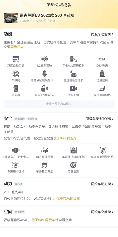 综上所述,雷克萨斯ES 2022款 200 卓越版在车况、配置、性能、空间、安全等方面均表现出色,是一款集豪华与实用于一体的中大型轿车。无论是日常通勤还是长途旅行,都能为驾乘者带来愉悦的体验。考虑到雷克萨斯品牌的市场口碑和车型保值率,这款车型适合追求高品质生活且预算充足的消费者购买。