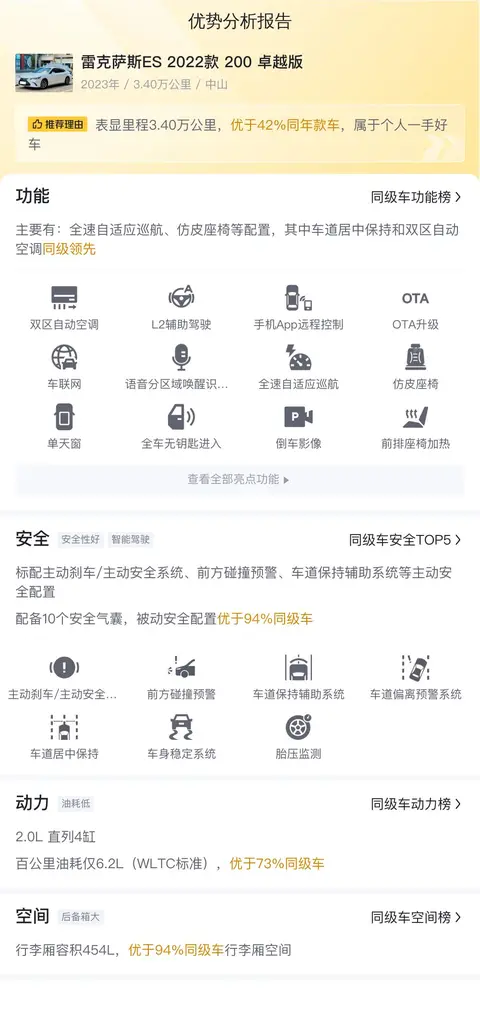 在购买二手车时,除了购车成本外,还需要考虑日常使用和维护的成本。对于雷克萨斯ES 2022款200卓越版来说,我们可以通过大数据分析来估算其平均每年的用车成本。这个成本涵盖了燃油、保险以及保养等方面的费用。需要注意的是,实际用车成本可能会因个人驾驶习惯、车辆维护状况以及地区生活成本等因素而有所变动。因此,在评估用车成本时,建议潜在买家根据自己的实际情况进行大致估算,以确保能够承担日常使用和维护的费用。