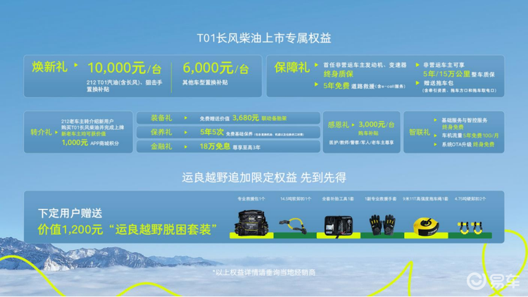 T01长风柴油上市售价19.88万元。为让更多用户轻松开启越野生活,T01长风柴油推出诚意上市权益:包括至高3年18万免息金融政策,T01汽油版及狙击手老车主可享10000元置换补贴;首任非营运车主更享发动机变速箱终身质保,5年5次免费基础保养,5年免费道路救援,以及联动备胎架及拖车包免费赠送;T01老车主介绍新用户购车,双方均可获得价值千元积分;军人、教师等特定群体额外享受3000元专属补贴。