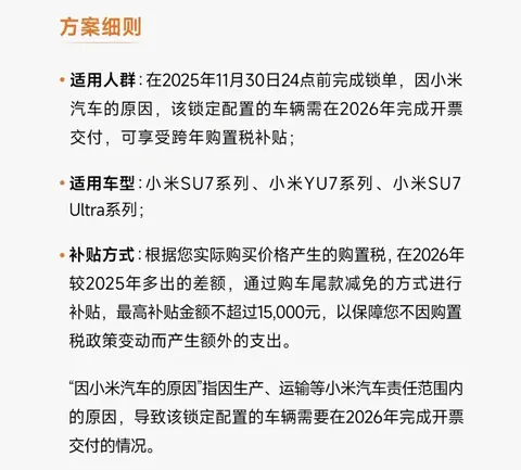 10月24日,小米汽车发布跨年购置税补贴方案。官方表示,推出该方案是为消除部分车主担忧车辆跨年交付后购置税优惠减少的顾虑,同时可以保障车主权益,避免因政策变动造成额外支出,小米汽车将为符合条件的用户提供最高1.5万元的购置税补贴。凡在2025年11月30日24时前完成锁单,因小米汽车生产、运输等原因导致车辆需到2026年完成开票交付的用户,可享受“跨年购置税补贴”。补贴车型包含了小米SU7系列、小米YU7系列及小米SU7 Ultra系列。补贴金额将根据车辆在2026年购置时较2025年政策产生的购置税差额计算,通过尾款减免形式发放,最高不超过1.5万元。小米方面称,该举措旨在保障车主权益,避免因政策变动造成额外支出。