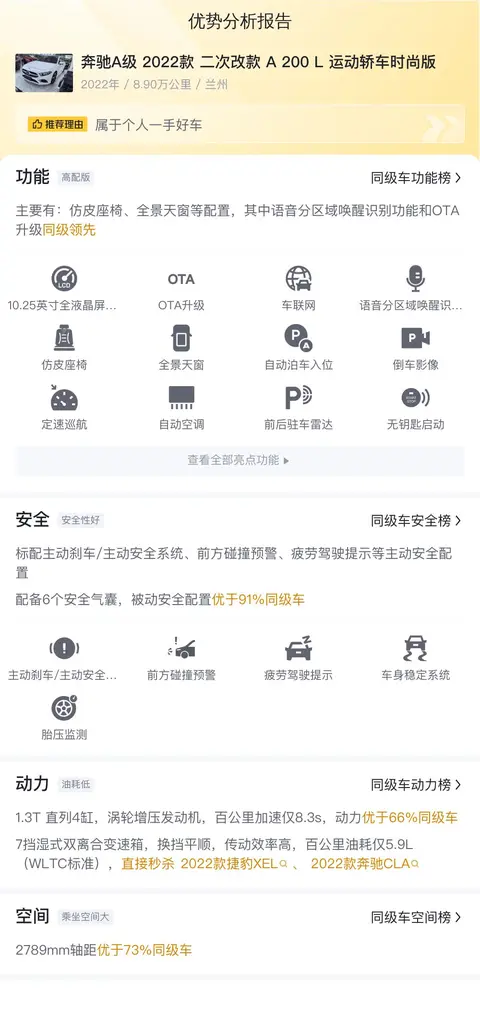 本次我们要介绍的是一款奔驰A级 2022款 二次改款 A 200 L 运动轿车时尚版,属于紧凑型轿车类别,采用5门5座设计。车辆于2022年8月在兰州上牌,至今行驶里程约为8.9万公里,符合国VI排放标准,车身颜色为白色。目前该车未进行过户,售价为11.5万元,比新车指导价低13.94万元。
